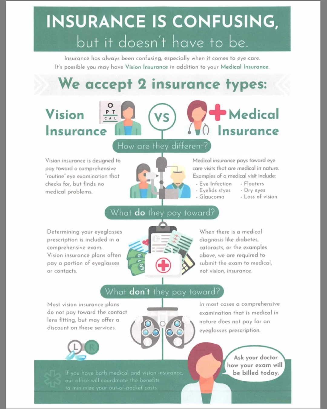 If you have both medical and vision insurance plans, our office will coordinate the benefits to minimize your out-of-pocket costs.